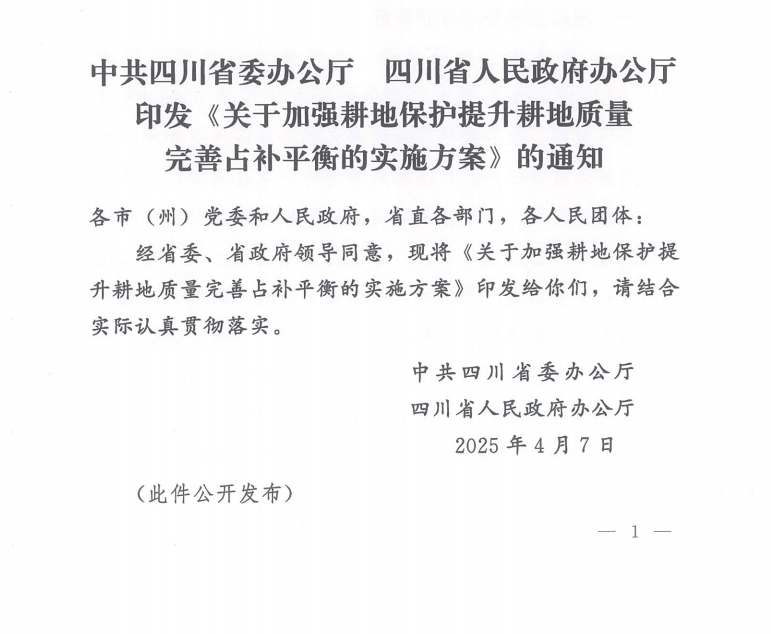 中共四川省委办公厅 四川省人民政府办公厅 印发《关于加强耕地保护提升耕地质量完善占补平衡的实施方案》的通知